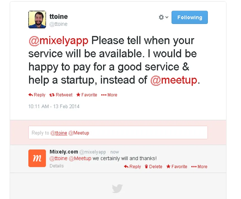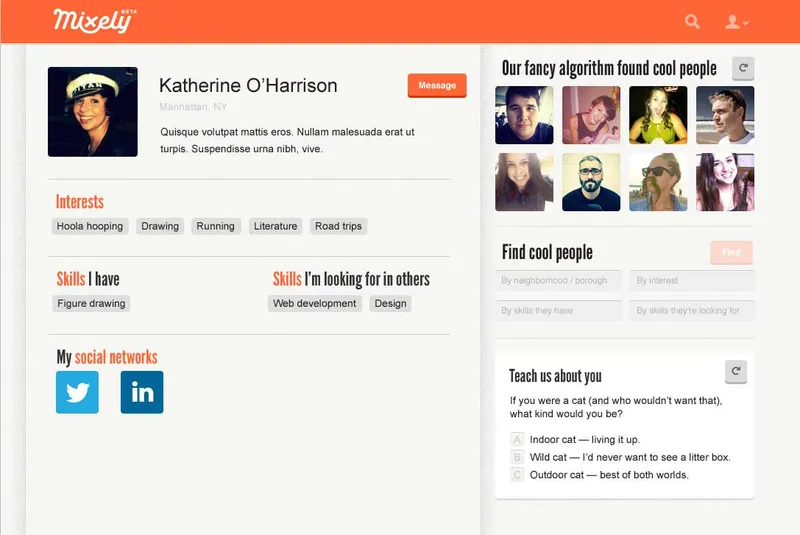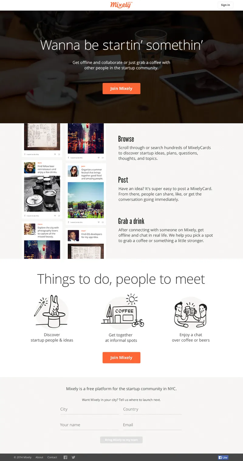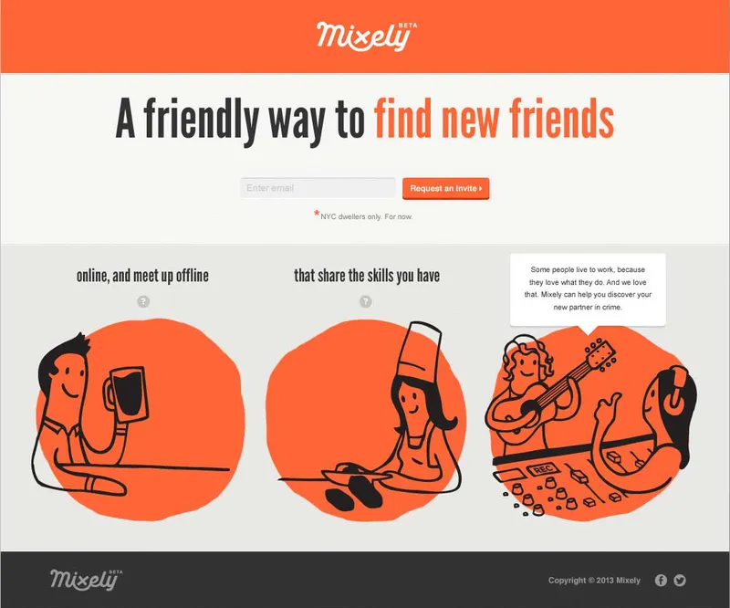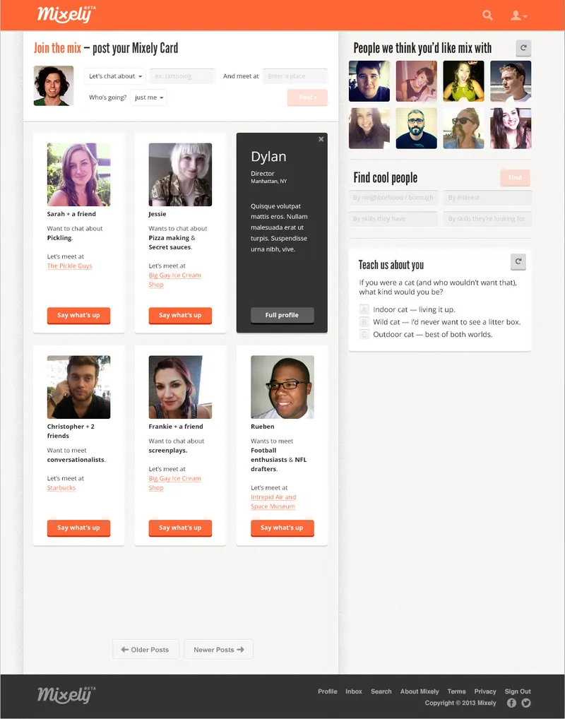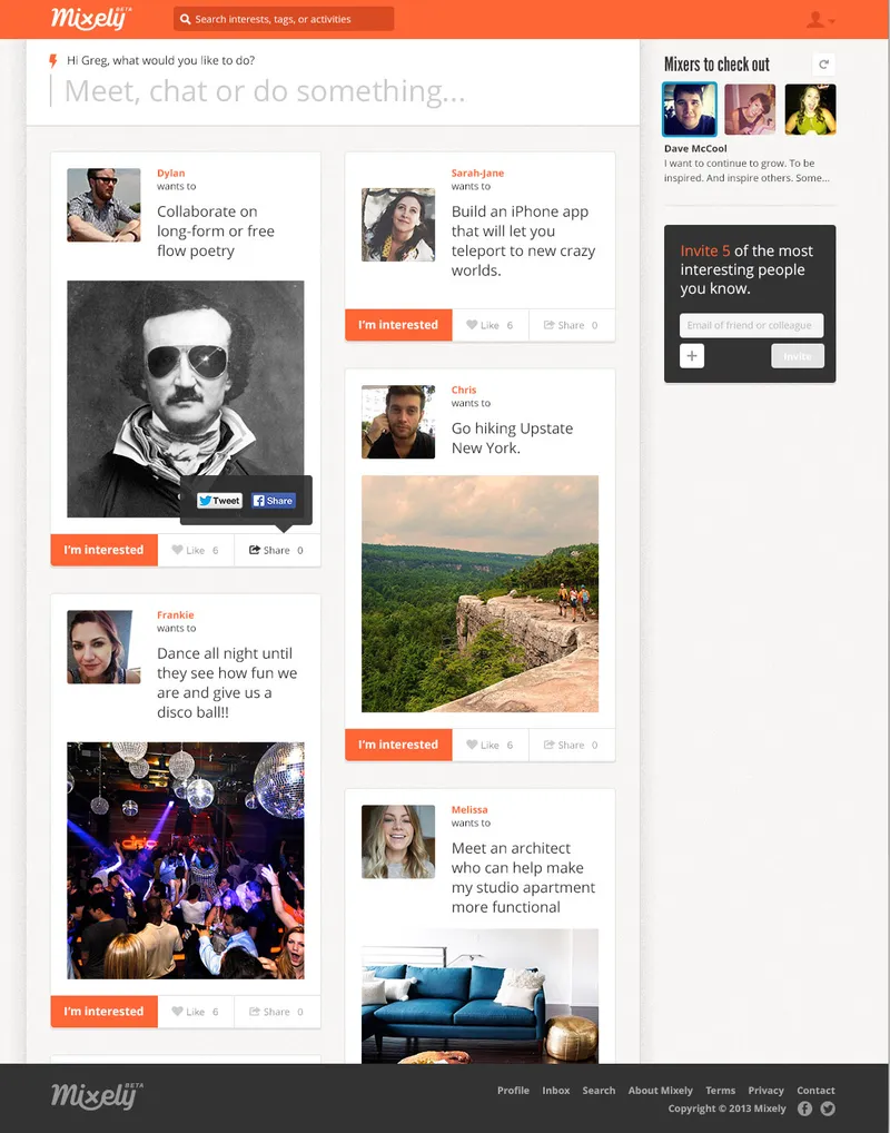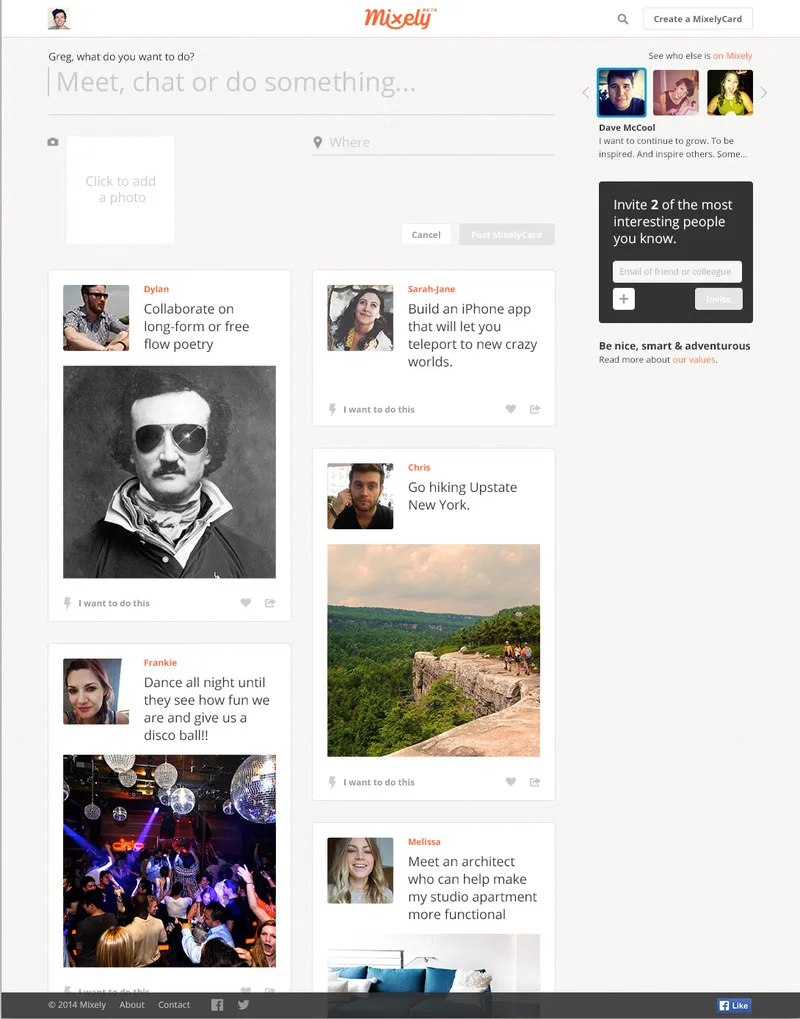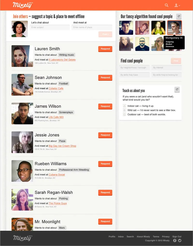 Mixely was an online community to meetup with like-mind individuals offline created by Raquel, Max, Greg, and myself.
