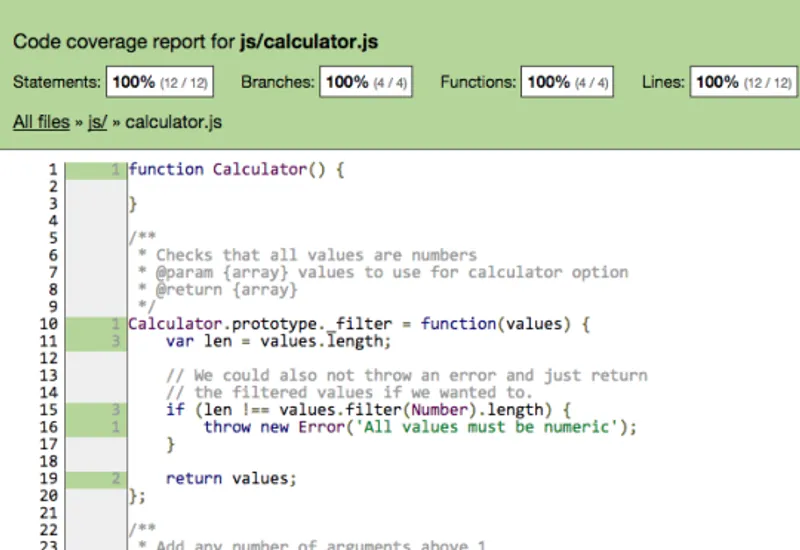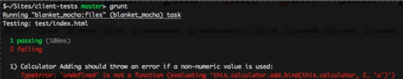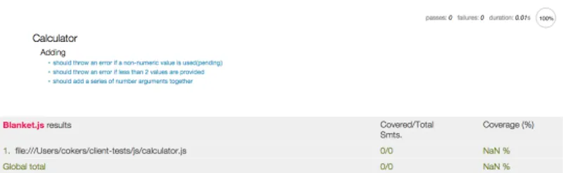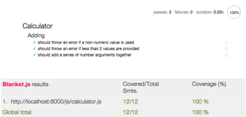 Blanket and Istanbul are code coverage tools that can instrument your code and tell you just how much of your code your tests run through.2 We will be using the grunt-blanket-mocha plugin in this guide as well, which uses Blanket. In most scenarios, it’s probably more common to use just one of these in your workflow, but we will take a quick look at both a little later.