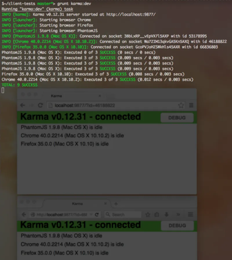 and let Karma do its magic. It should start up Chrome and Firefox and run tests in the browsers as well as in PhantomJS.