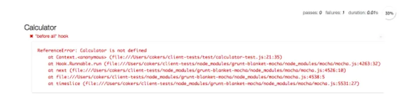If you’re using any HTML fixtures you’ll need to know one more thing. In the before function in calculator-test.js you’ll need to have the HTML be injected into the body when the tests run. The before function should now look like: