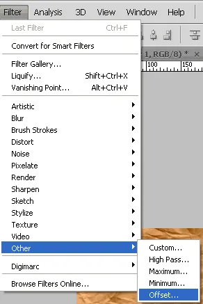 The creases are what we will be getting rid of in order to achieve a cohesive pattern. The trick behind this technique is a filter called offset which is in the bottom of the filter menu under “Other” as shown below.