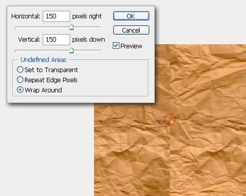 That would be 150px for both values. Make sure you also have “Wrap Around” selected as well as the Preview box checked which allows you to see the results of entered offset values as shown below.