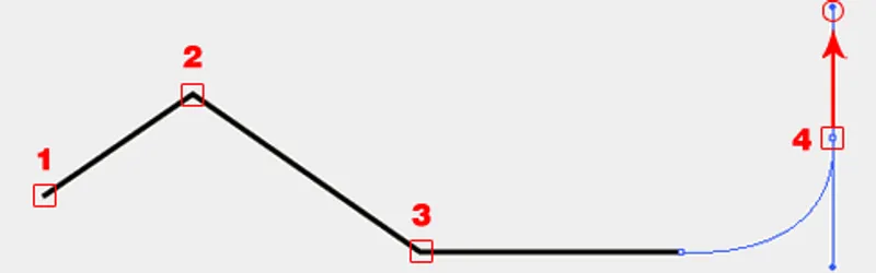 The image below shows square #1 – #3 which represent single mouse clicks which create anchor points. Square #4 represents a mouse click/anchor point as well, except this time, you drag up to the circle. This creates what is called a bezier curve.
