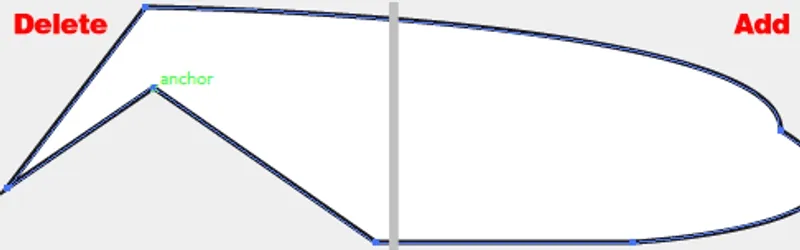 The last two faces of the pen tool are the add anchor point tool and the delete anchor point tool. You can also access these tools by holding down on the pen tool in the dock, however that shouldn’t be necessary. By default, if you hold your pen tool over a selected path, you will see a plus sign appear next to the pen cursor. If you hover over an anchor point, a minus will appear. By deleting an anchor point, the outside points connect. By adding a point, it gives you another anchor to manipulate illustrated below.